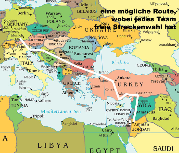 Karte groß mit LändernEs gilt freie Streckenwahl für jedes Team. Benutzung von Autobahnen und Mautstraßen ist jedoch tabu!